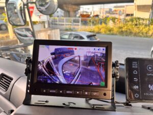 車両左側のドアの死角を映像で確認できるので左折時の巻き込み防止になります。
